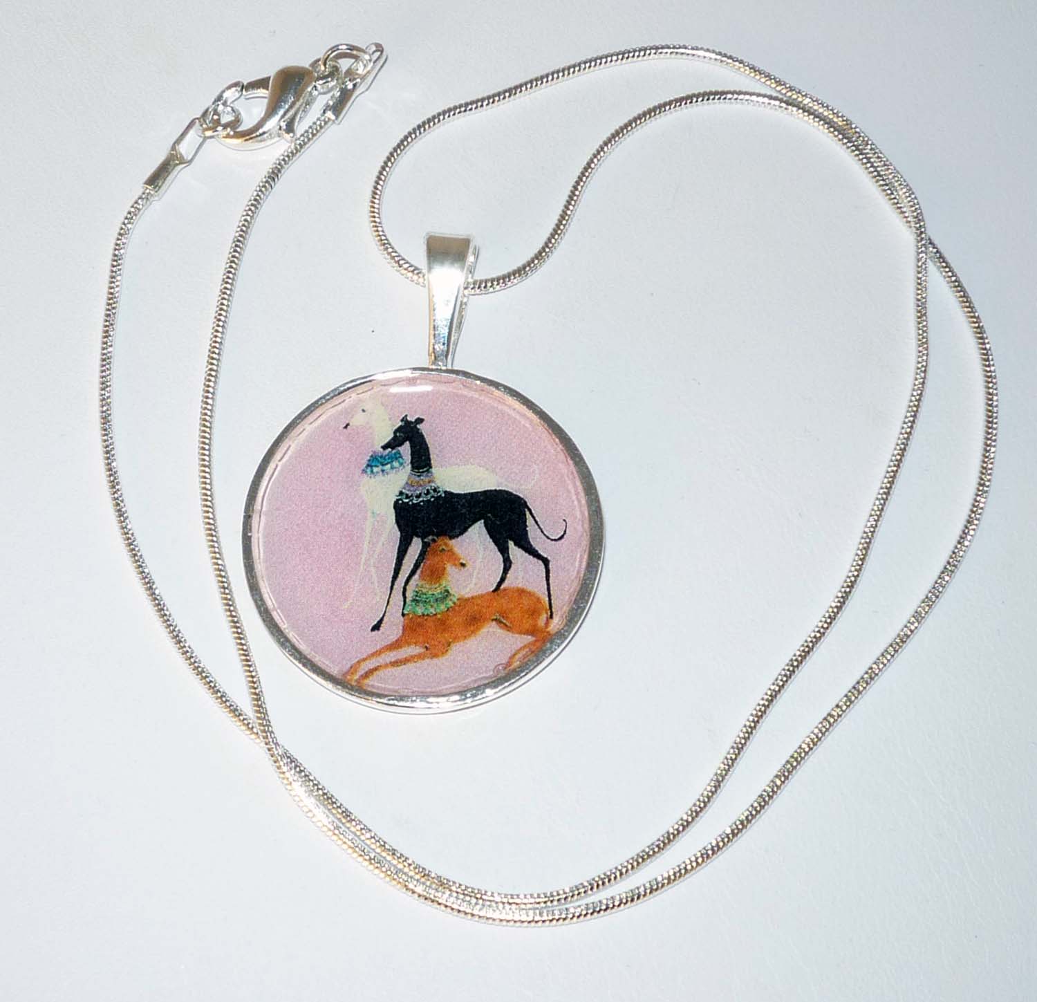 Vintage Art Deco image of 3 Greyhound Dogs or Whippets in a silver plated round setting - the lovely pendant is approximately 1" diameter. The silver plated snake chain necklace is about 16", with lobster clasp. Handcrafted items are each unique, so some variation is possible.