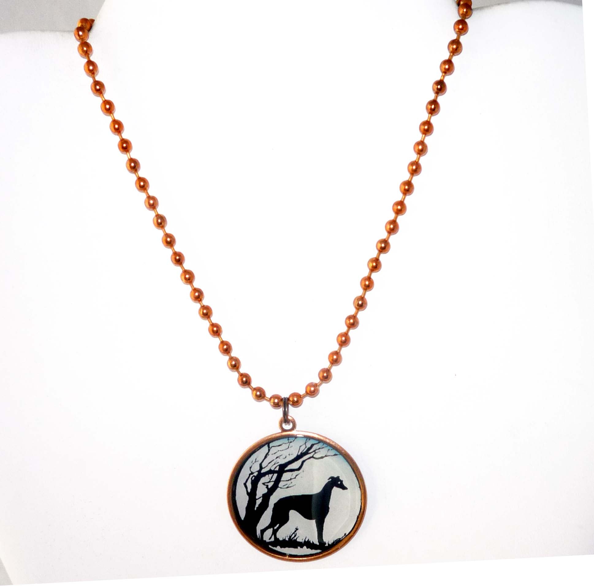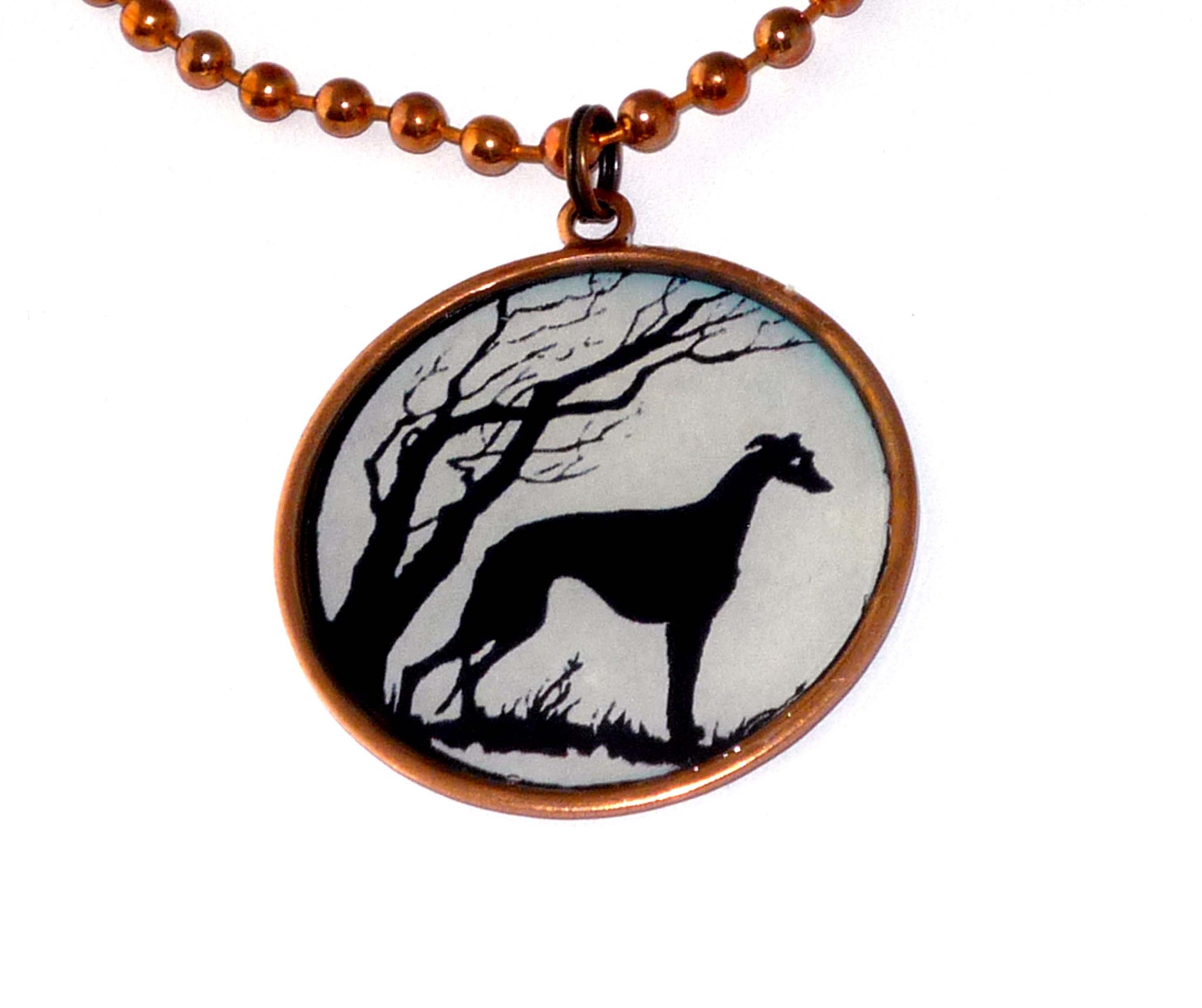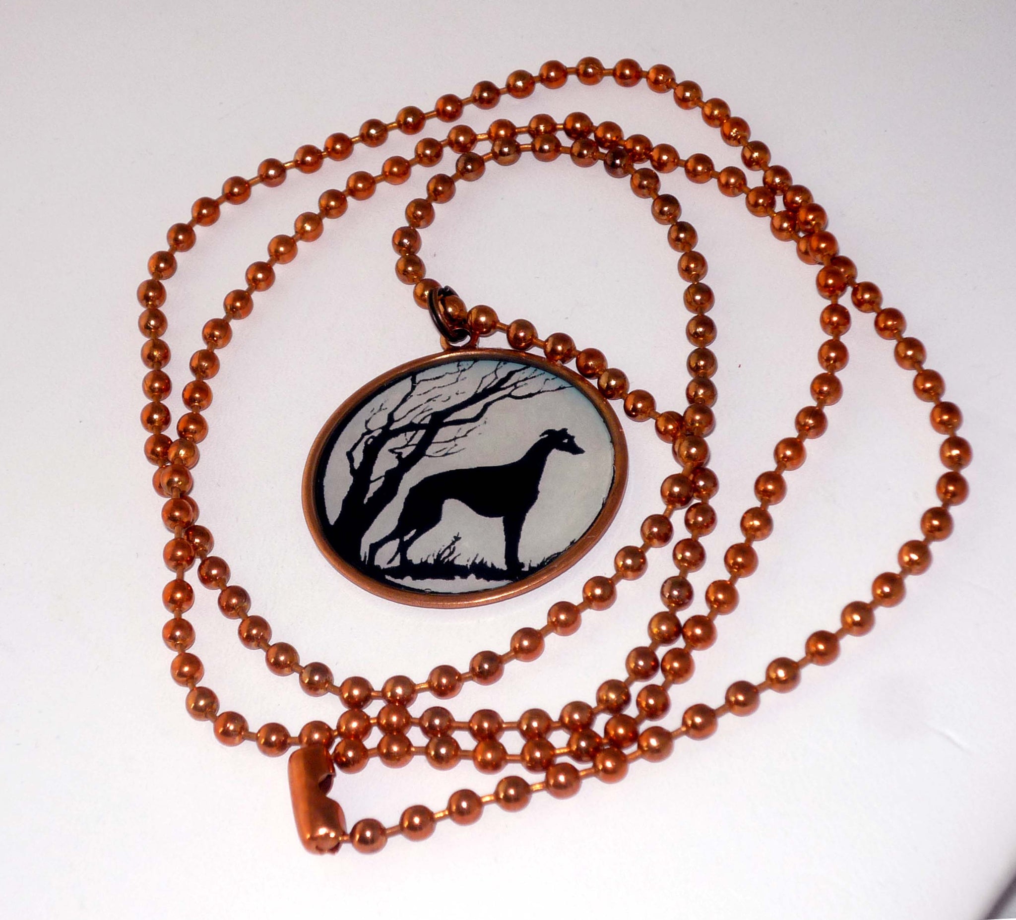 Altered Art Dog Jewelry. Vintage Greyhound dog silhouette in a round copper setting - the eye-catching pendant is approximately 1-1/4" diameter, not including the loop. The copper ball chain necklace is about 22" (to shorten, cut off whatever length you don't want), with ball chain connector clasp. Handcrafted items are each unique, so some variation is possible.