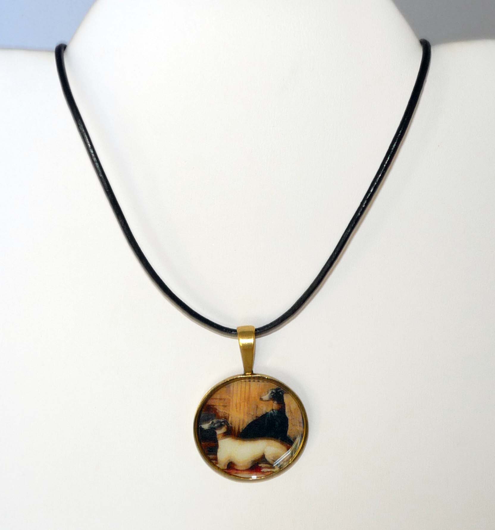 Vintage tapestry yields this wonderful detail of two Greyhounds or Whippets in an antiqued gold plated setting - the lovely pendant is approximately 1" diameter. The genuine leather necklace is about 16", extends to about 19", with lobster claw clasp. Handcrafted items are each unique, so some variation is possible.