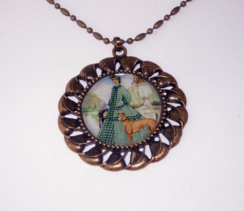 Altered Art Lady with Two Greyhound Dogs Pendant Necklace