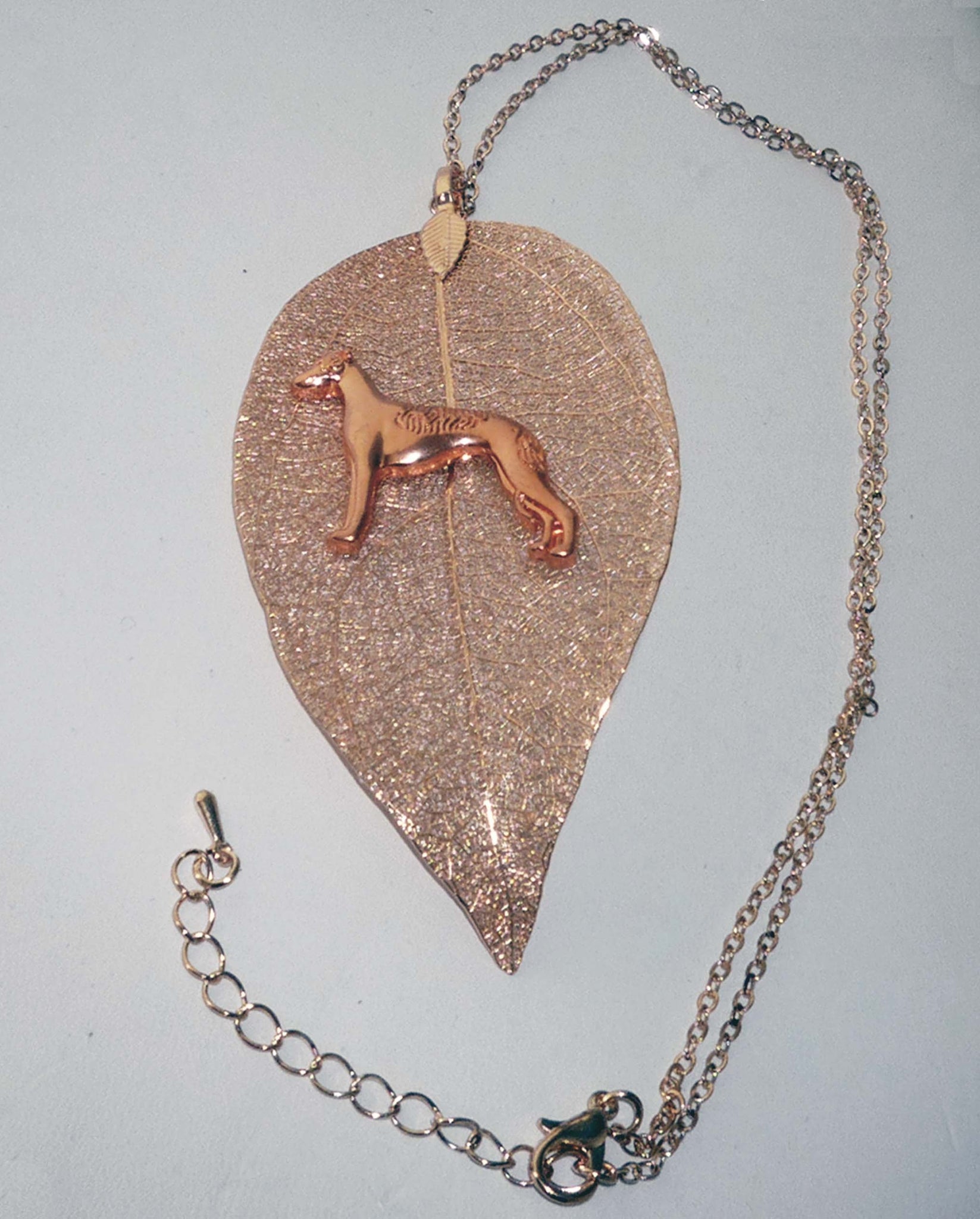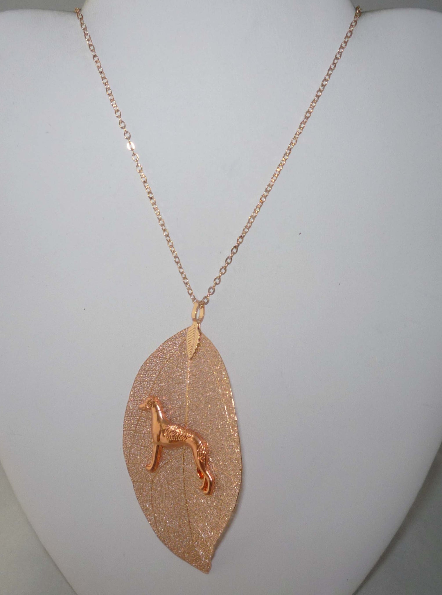 Greyhound Dog Jewelry. A real leaf is coated in rose gold plating, and fashioned into a bold pendant. The rose gold Greyhound dog is in his best show stance. The pendant is approximately 3" high with the loop and about 1-1/2" wide. The rose gold chain necklace is 18" with lobster clasp and 3" extender.