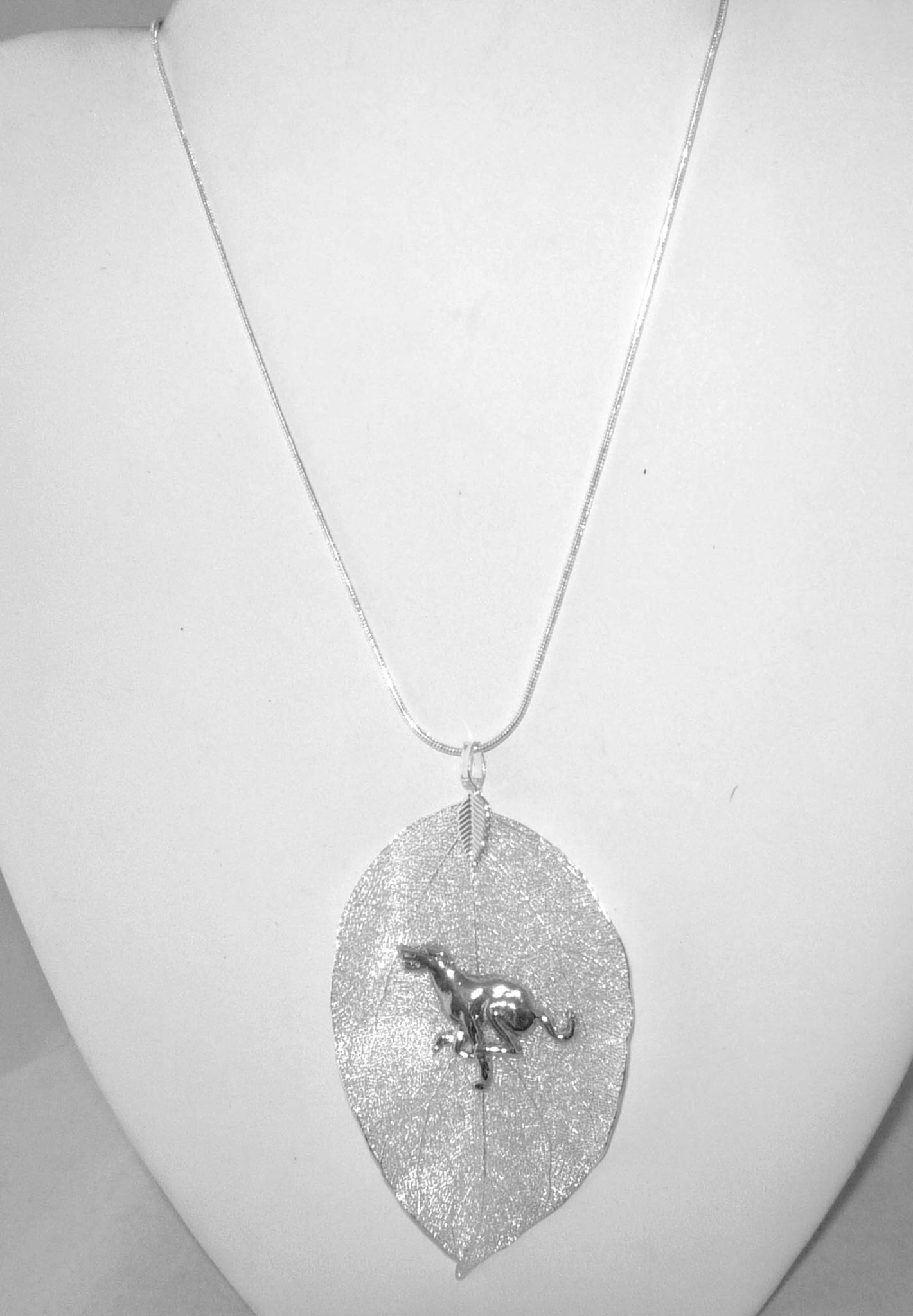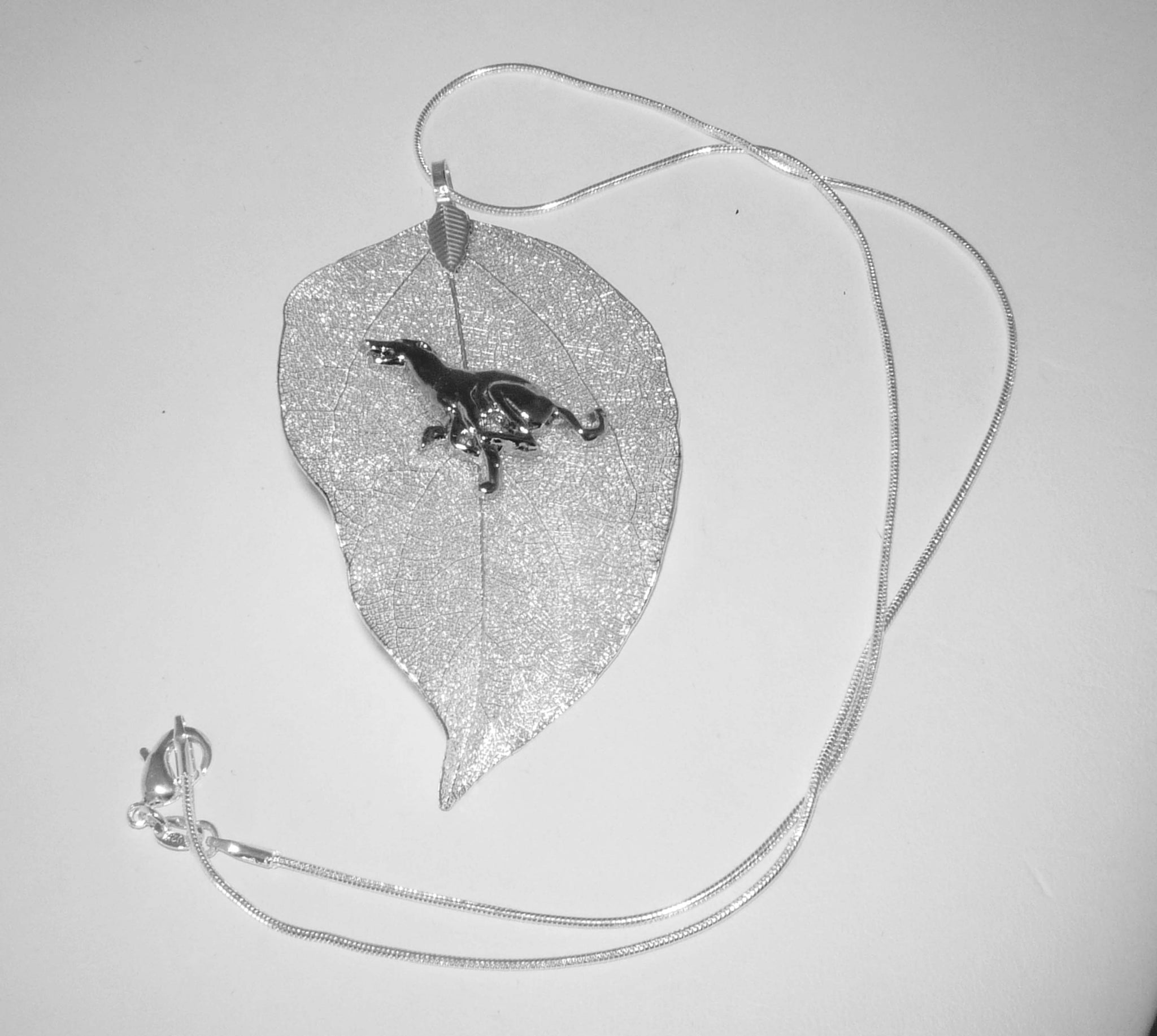 Greyhound Dog Jewelry. A real leaf is coated in silver plating, and fashioned into a bold pendant. The silver-plated Greyhound dog is in full dig mode! The pendant is approximately 3" high with the loop and about 1-1/2" wide. The silver plated snake chain necklace is 18" with lobster clasp.