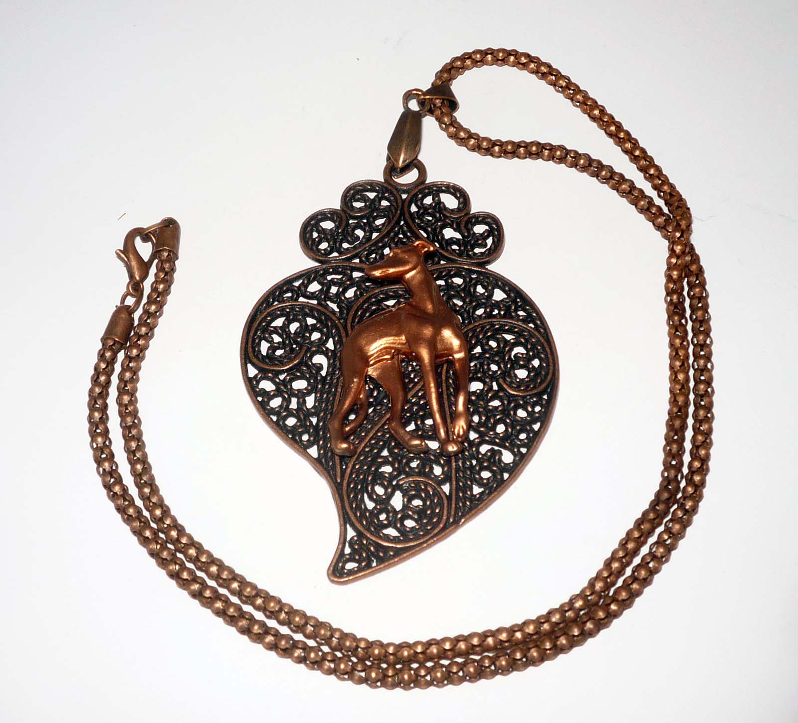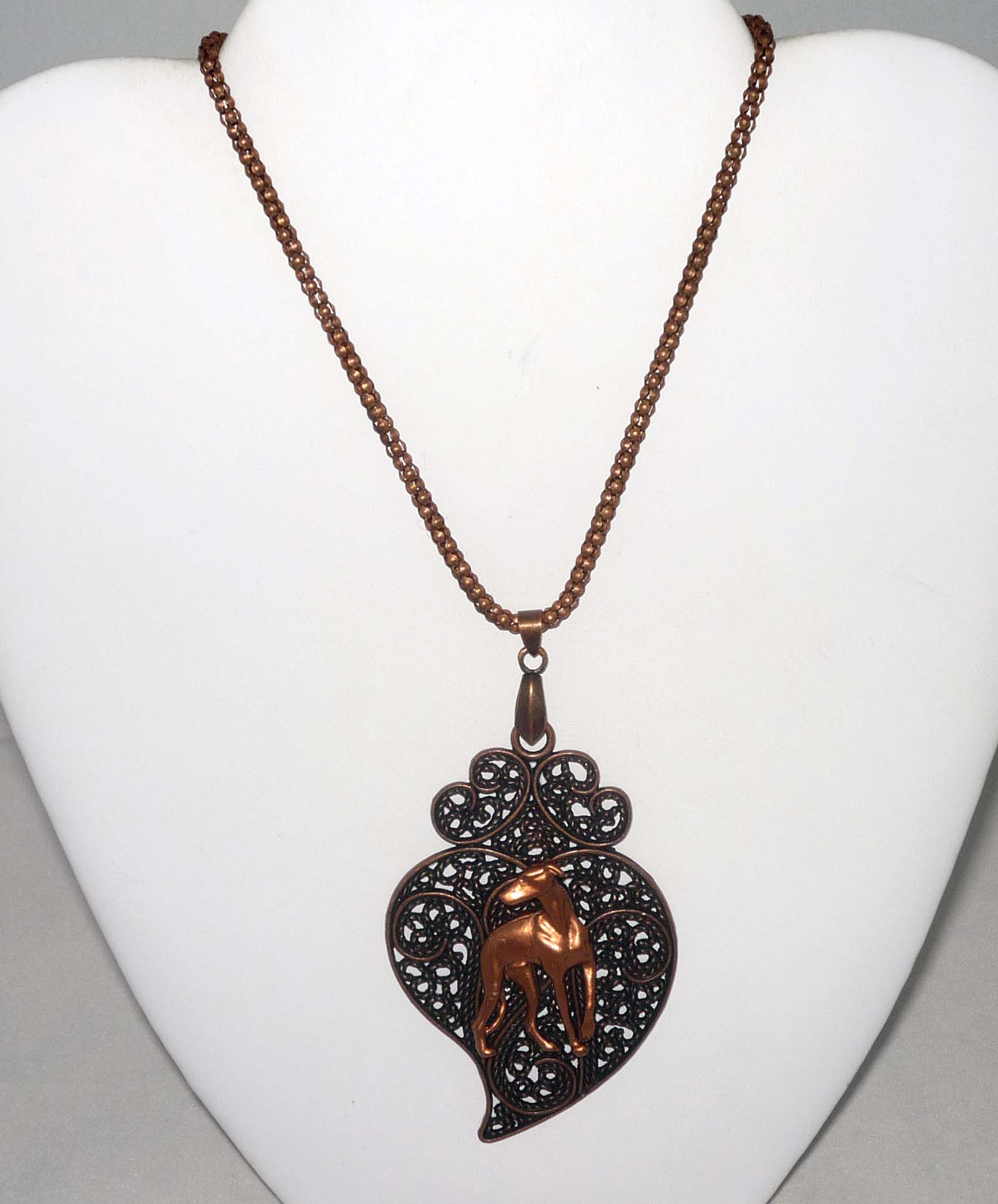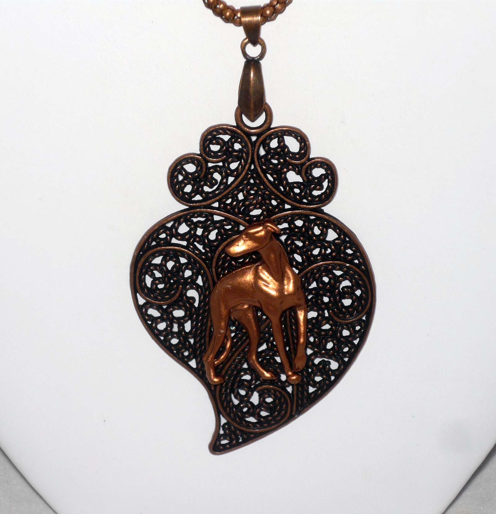 Antique copper leaf embellished with intricate patterns and swirls is the ideal setting for the copper greyhound or whippet dog in the classic looking back stance. Pendant is about 2" wide x 3" long (not including bail). The hollow antiqued copper snake chain necklace is approximately 20" with lobster claw clasp. Handcrafted items are each unique so please allow for some variation.