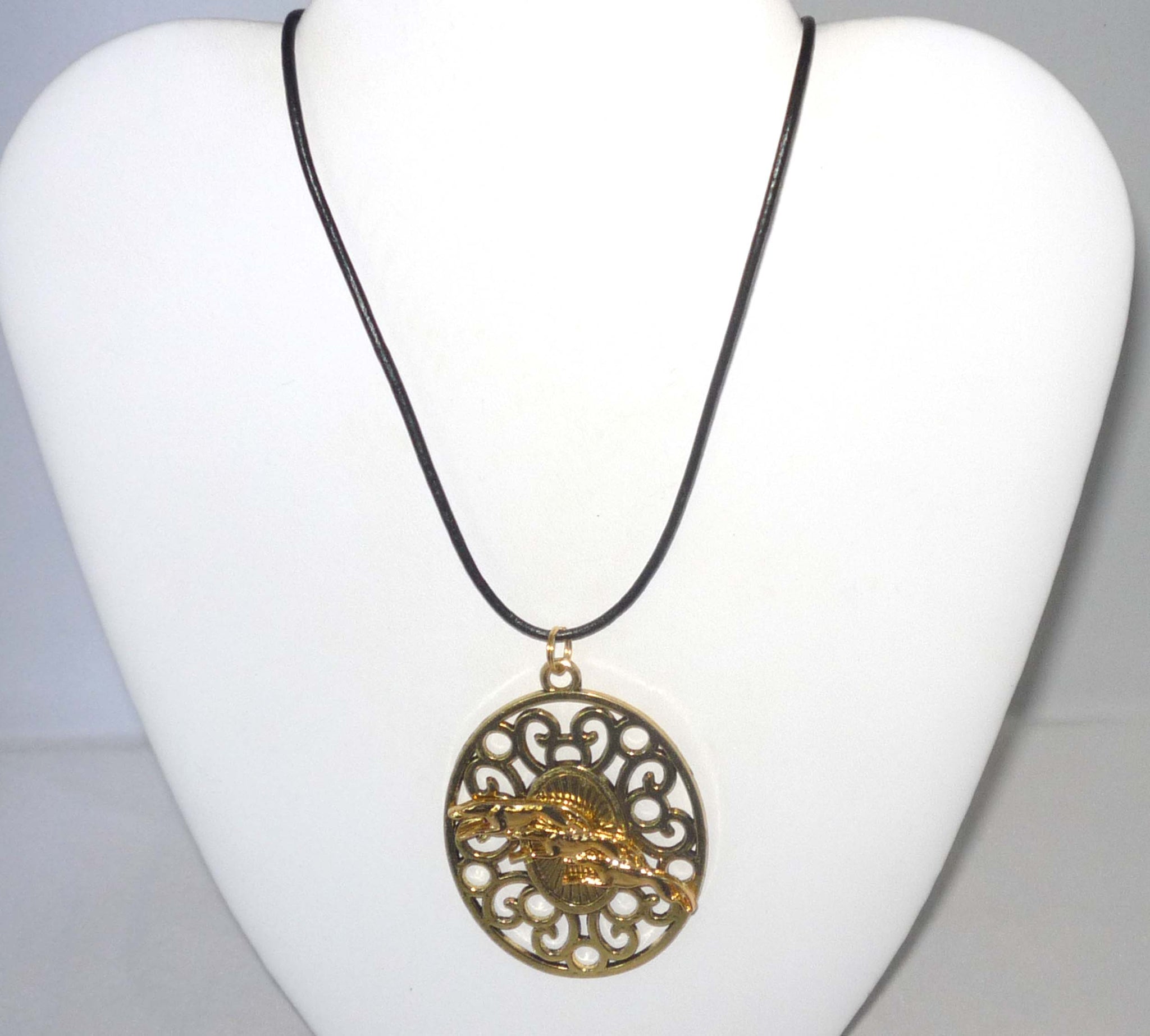 Ornate goldtone medallion shows off the gold plated pack of three running greyhounds or whippets. Oval medallion is about 1-7/8" wide x 2-1/2" high. Genuine leather necklace is approximately 16", with extender and lobster claw clasp.