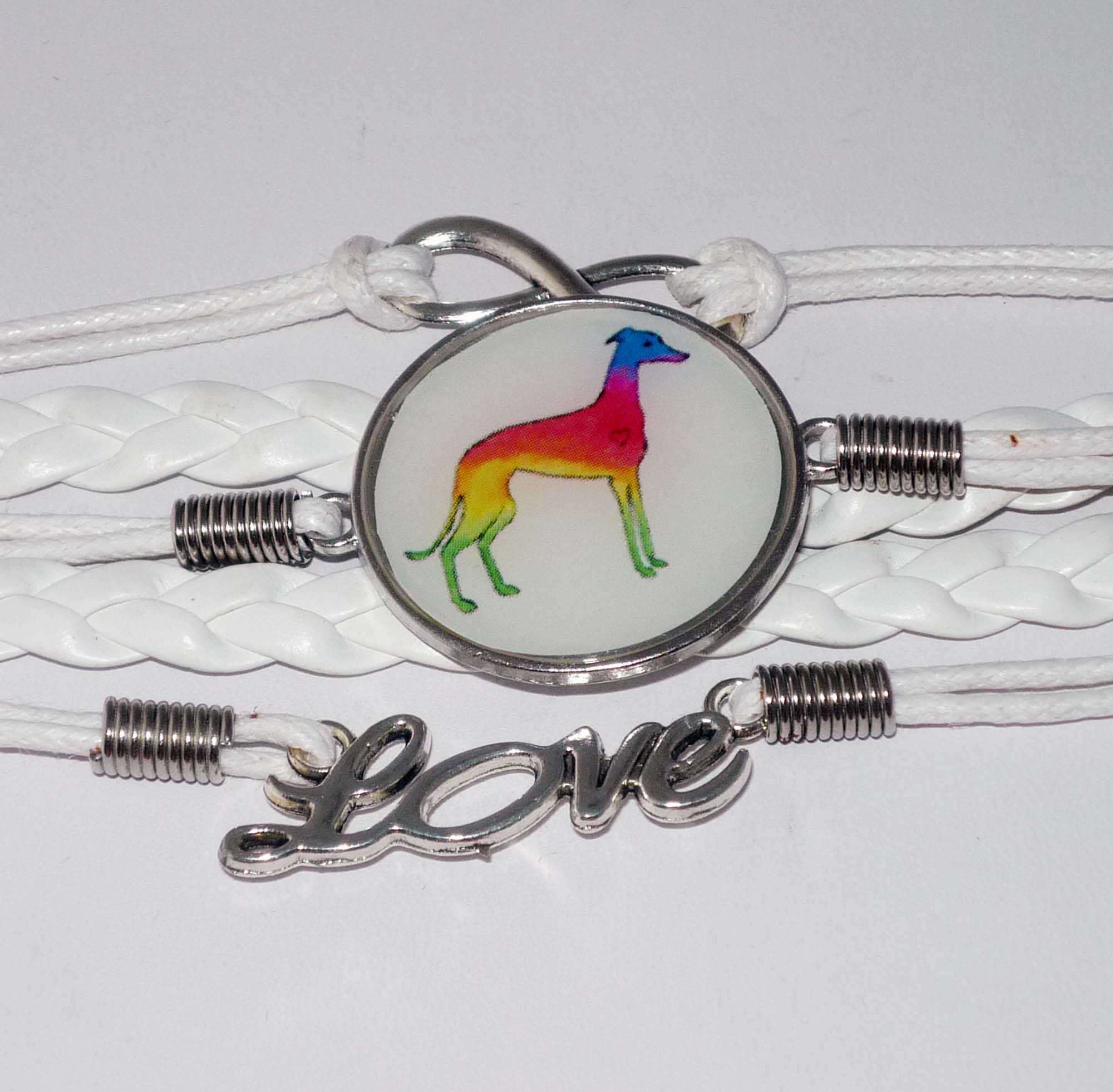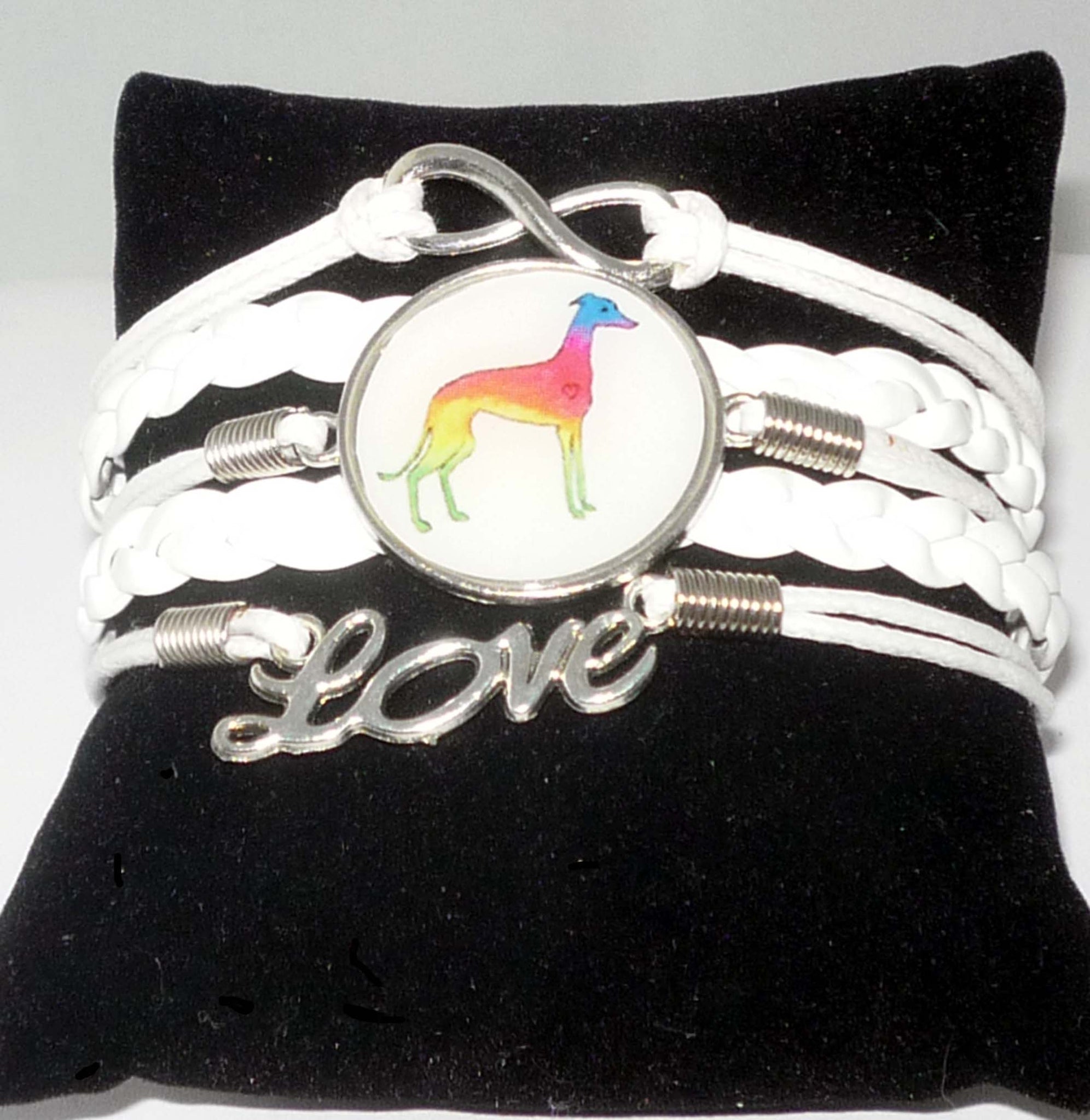Happy Rainbow Silhouette Greyhound or Whippet perfectly complements the white and silver cord and PU leather bracelet. Bracelet is about 6-1/2" long, with lobster clasp and 2" extender chain. This bracelet would make a lovely gift (request gift box at checkout).