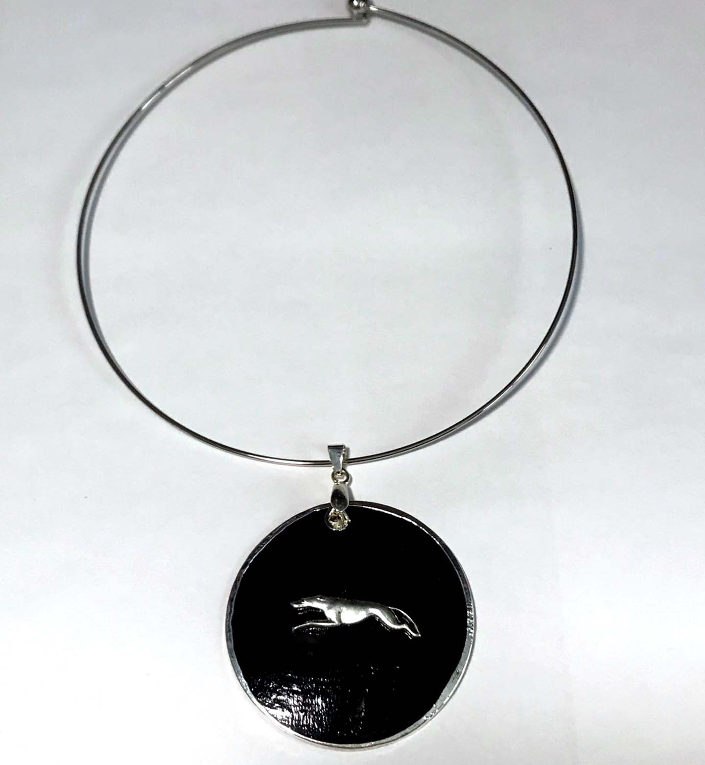 Elegant black shell pendant adorned with a silver plated stretch running Greyhound dog is approximately 2" in diameter, with a 5-3/8" diameter silvertone neckring. Matching earrings available in my store.