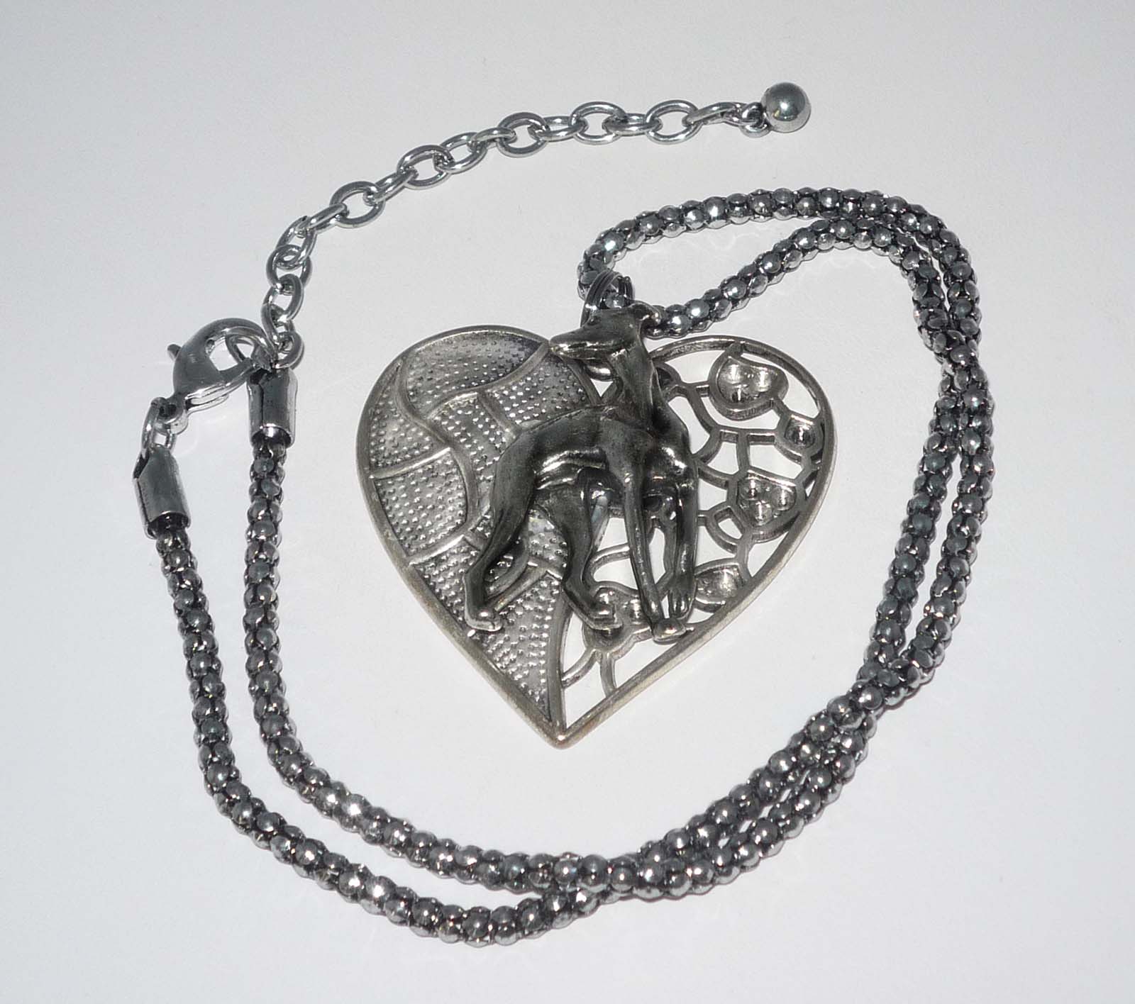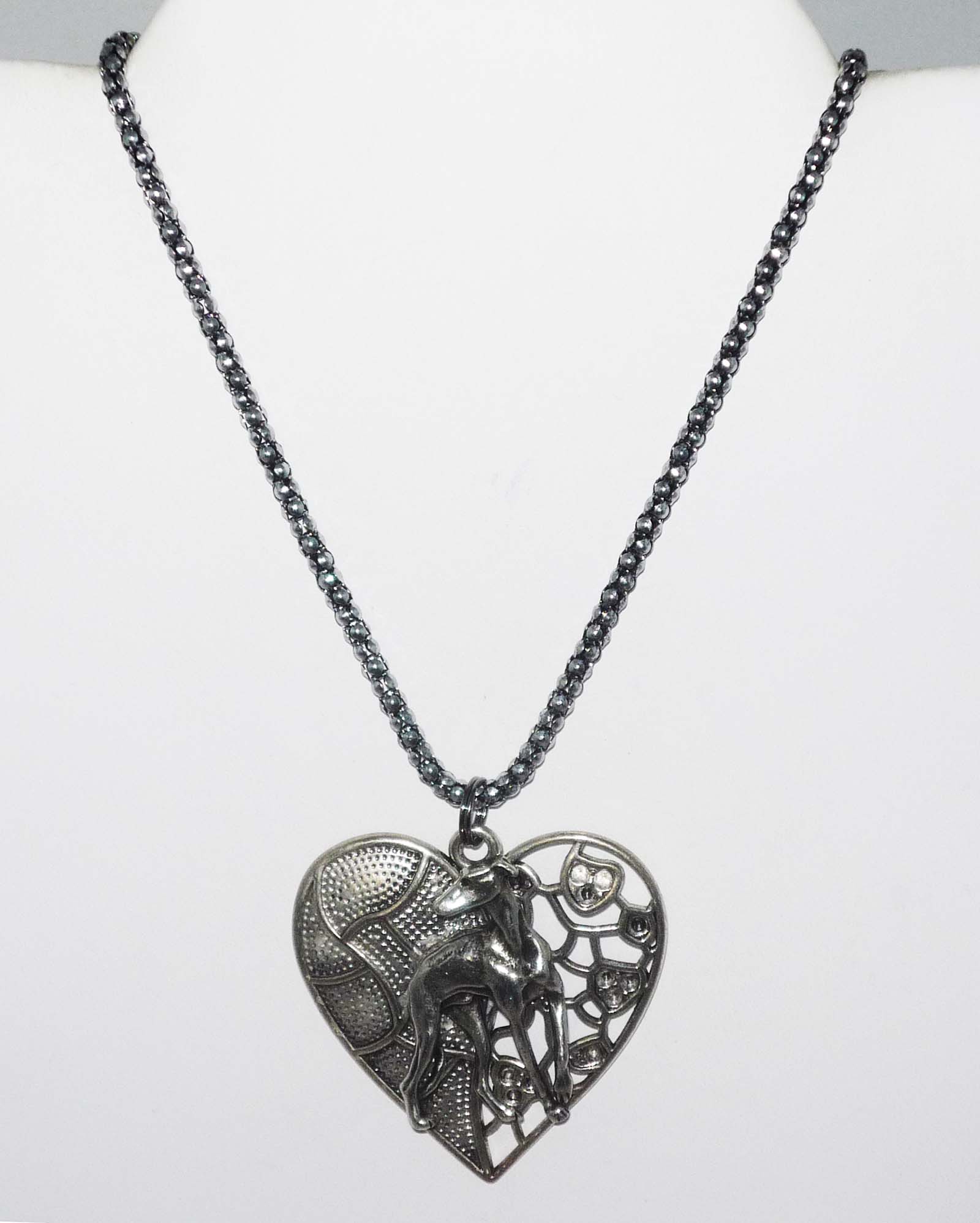 Pewter heart pendant with a creative mix of textures, including cut work, showcases the pewter greyhound or whippet dog in the classic looking back stance. Pendant is about 1-3/4" wide x 1-3/4" long. The hollow antiqued silver plated snake chain necklace is approximately 20" with lobster claw clasp. Handcrafted items are each unique so please allow for some variation.