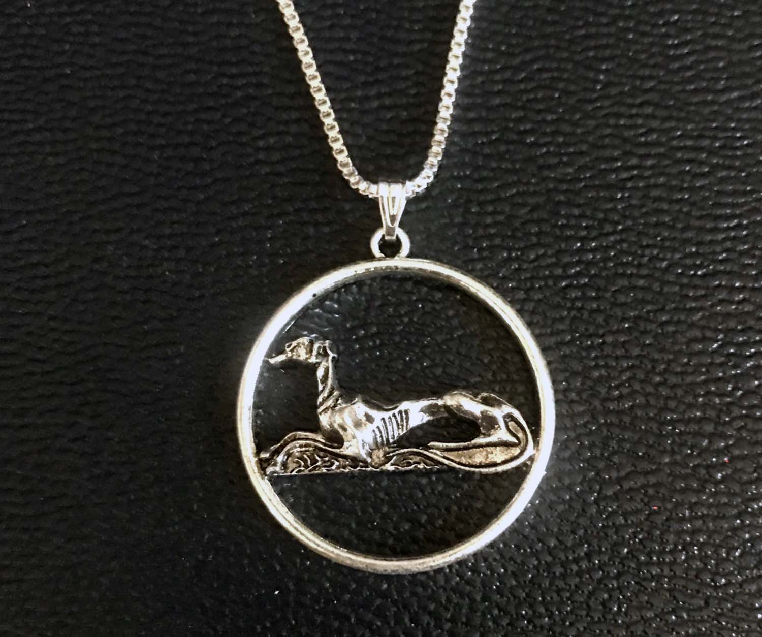 Pewter reclining Greyhound or Whippet pendant. Pendant is about 1-1/2" diameter. Silver plated box chain necklace is approximately 18", with lobster claw clasp.