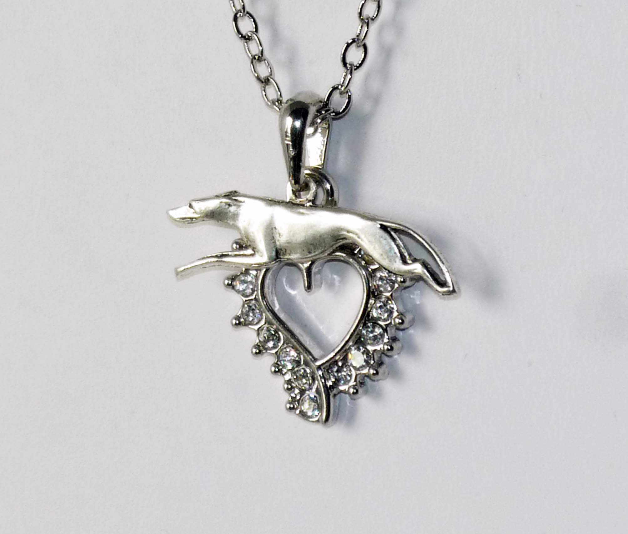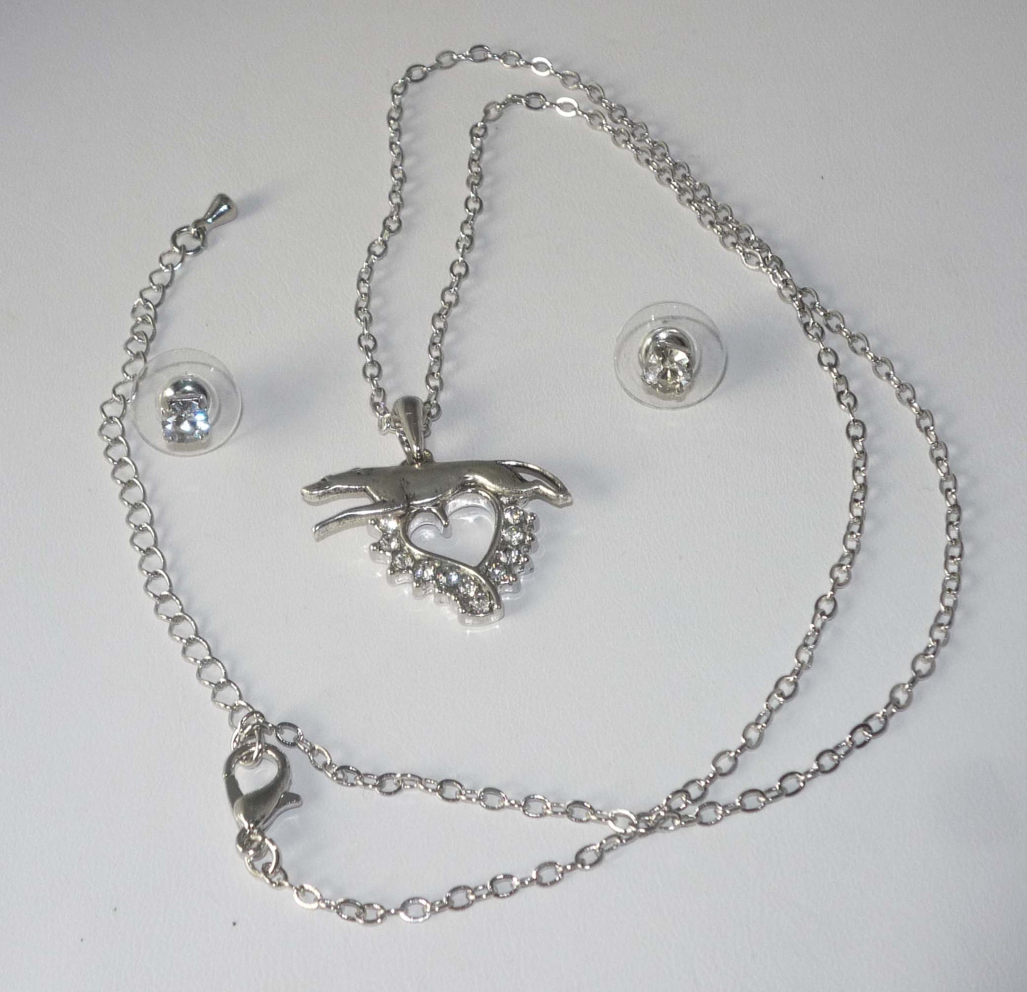 Greyhound Dog Jewelry Gift Set. Sweet silver plated and crystal heart with Greyhound or Whippet in full flight, 18-1/2" necklace with lobster clasp and extender chain, crystal solitaire post earrings. Gift boxed.