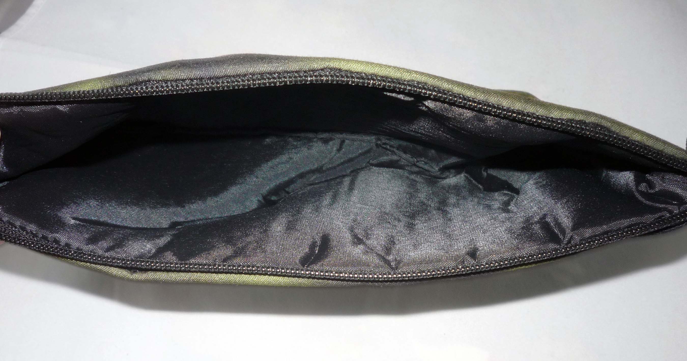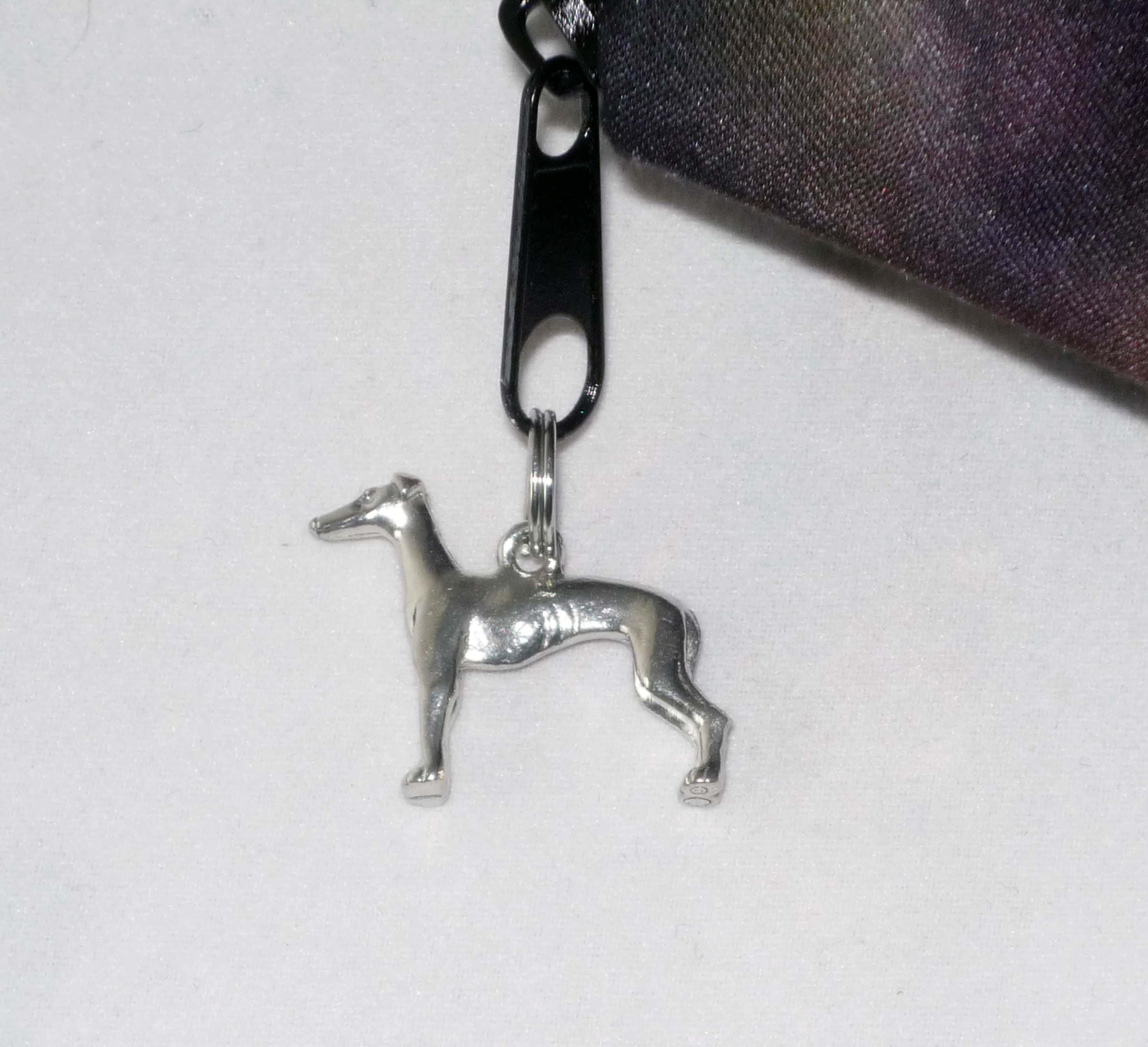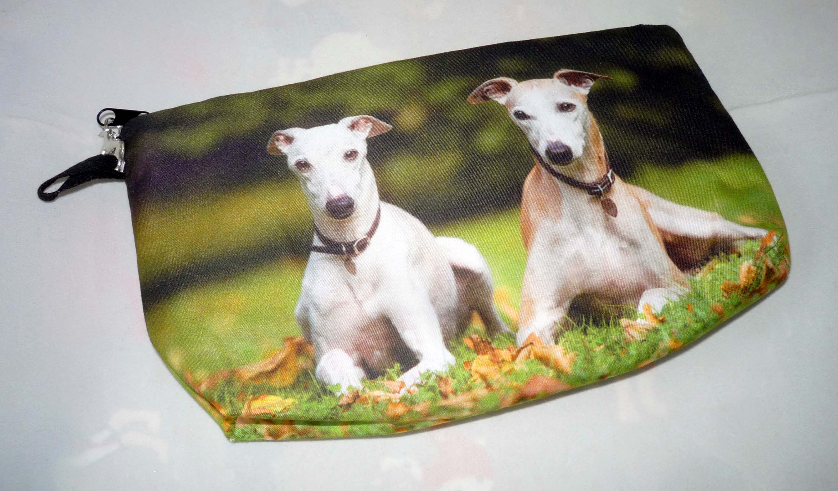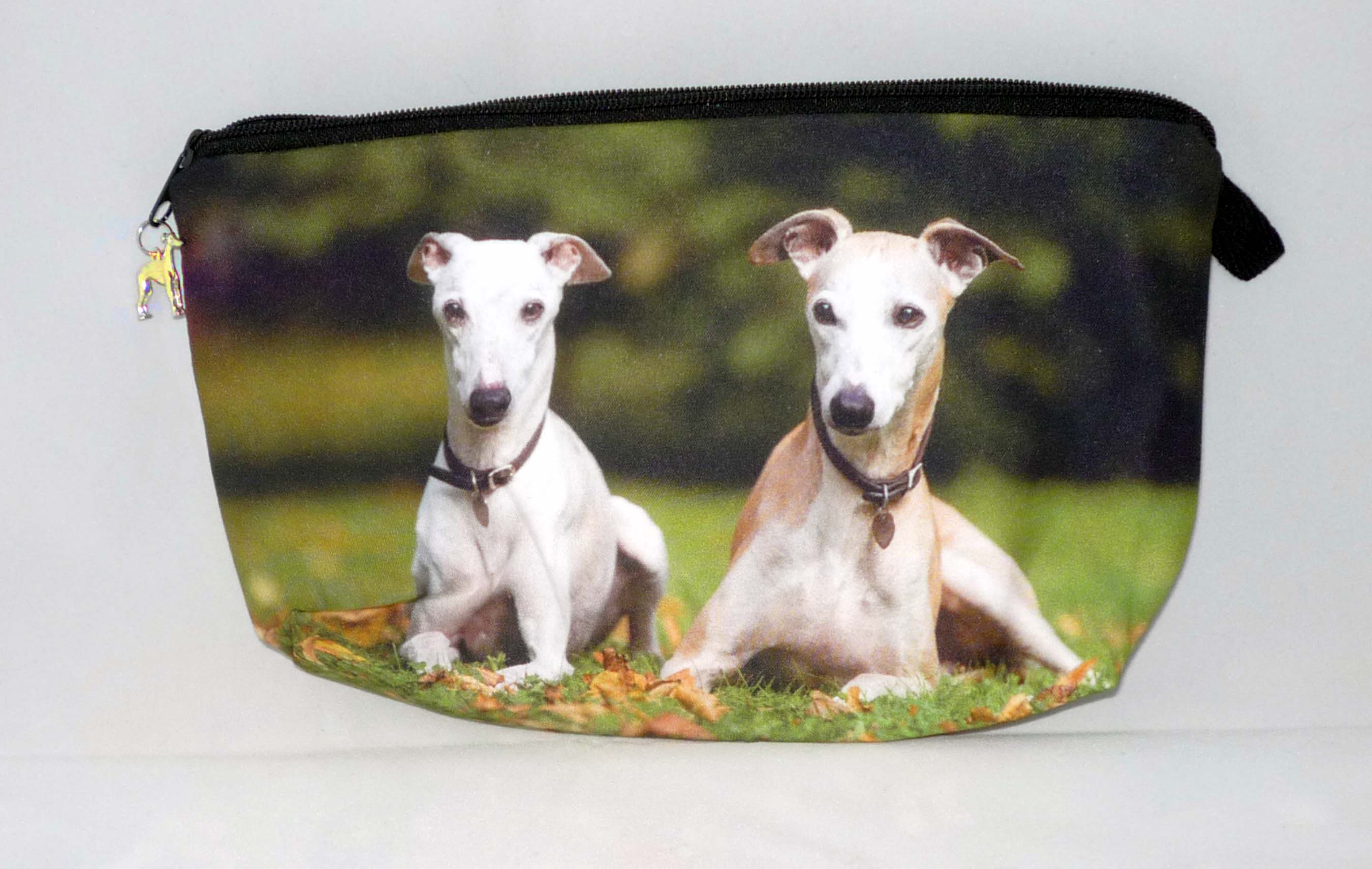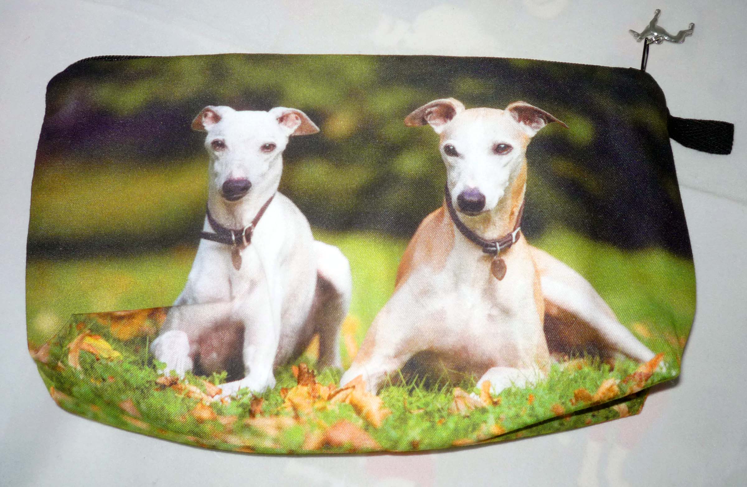 This eye catching microfiber zipper clutch is printed with a pair of reclining Greyhounds or Whippets. The zipper pull is a silver plated standing Greyhound charm. Handy size bag is perfect for so many uses, from toting your phone, makeup, cards, snacks, etc. or pens, pencils. Sturdy print microfiber front and back. Fully lined interior. The Greyhound charm is about 1" diameter. Bag dimensions: 8-1/2" wide x 5" high x 1-1/2" deep. Hand wash or spot clean.